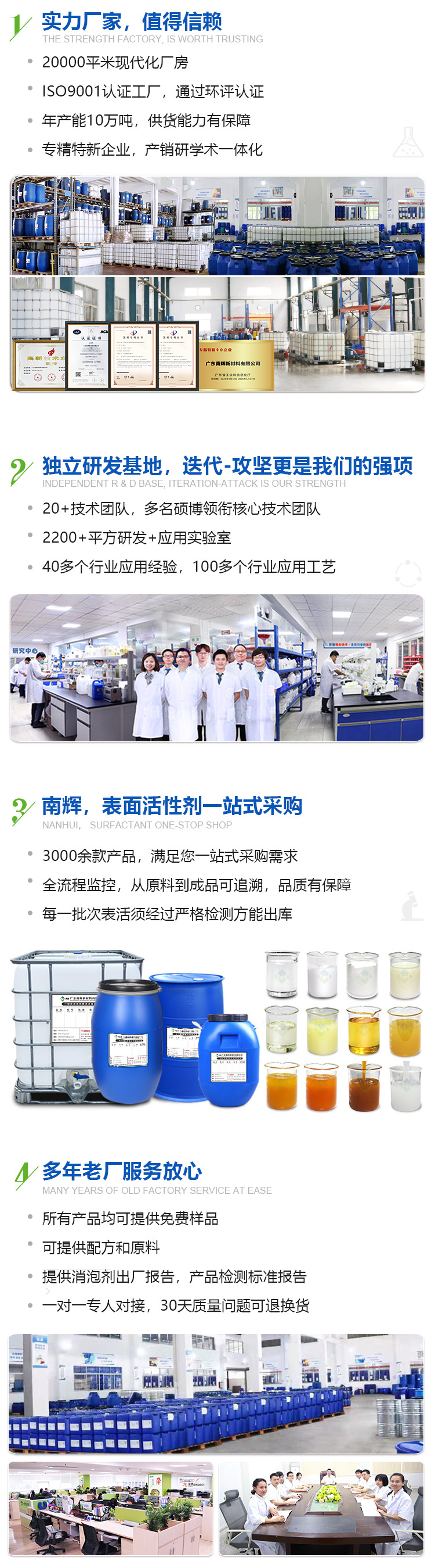 • 廣東南輝新材料有限公司,是一家致力于表面活性劑研發、生產、銷售為一體的國家高新技術企業,擁有獨立的研發基地,主要研發產品有:乳化劑、滲透劑、勻染劑、司盤、吐溫、消泡劑等3000余款產品。南輝擁有20000平方米的現代化生產車間,年產能可達10萬噸。通過ISO9001:2015質量管理體系認證,已獲得十余項不同產品的發明專利授權,被評為廣東省"專精特新"企業。從2018年開始批量出口至俄羅斯、日本、馬來西亞、印度、秘魯等國家,已成為國內目前主要的表面活性劑生產廠家。